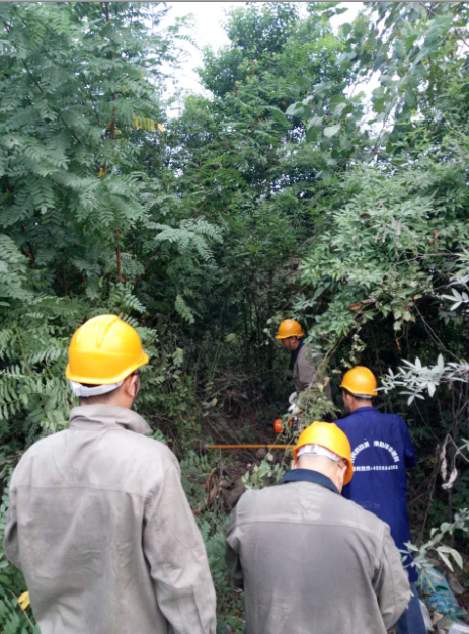 加壓站負責(zé)維護供電線路總長為16公里,且大多穿越山林,夏季樹木長勢格外迅猛,掃林任務(wù)顯得更加繁重。在密閉的樹林里異常悶熱,到處都是蚊蟲樹刺,巡線人員早上7點之前就早早出發(fā),戴著安全帽穿著厚厚的工作服,,頂著火辣辣的太陽,流血流汗,消滅影響供電安全的每一處樹障。(圖為工作人員正在砍伐樹障)