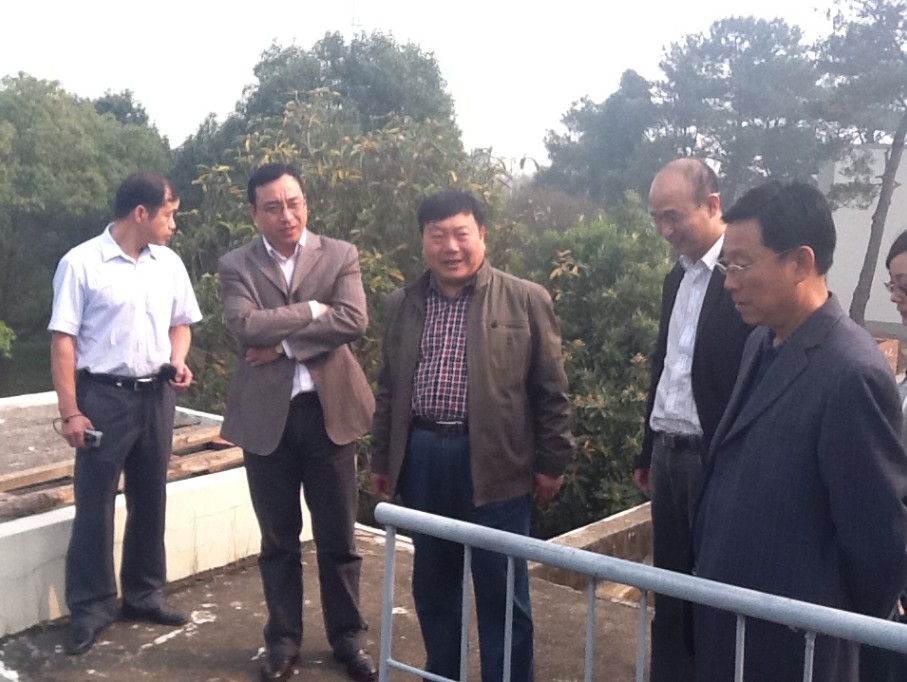 10月21日,省物價(jià)局環(huán)境與資源價(jià)格處吳賢武處長(左三)、成本調(diào)查監(jiān)審分局吳勤民科長(左二)在市物價(jià)局局長汪順彪(右二)、總公司黨委書記陳永根(右三)陪同下視察市二水廠。