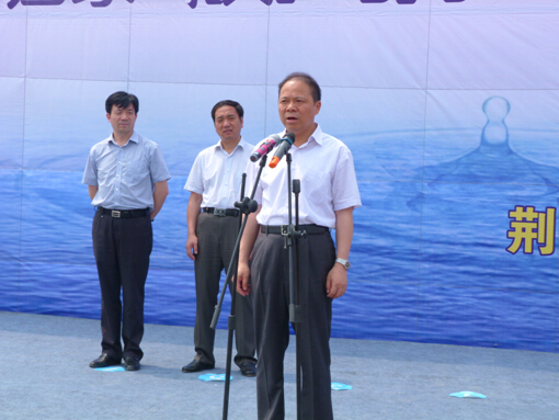 總經(jīng)理陳衛(wèi)國(中)和屈家?guī)X管理區(qū)工委書記湯旺林(右二)、工委主任鄭斌(左一)、市水務(wù)局局長曾云(右一)商談施工事宜。 ![]() 市委書記萬勇宣布工程開工