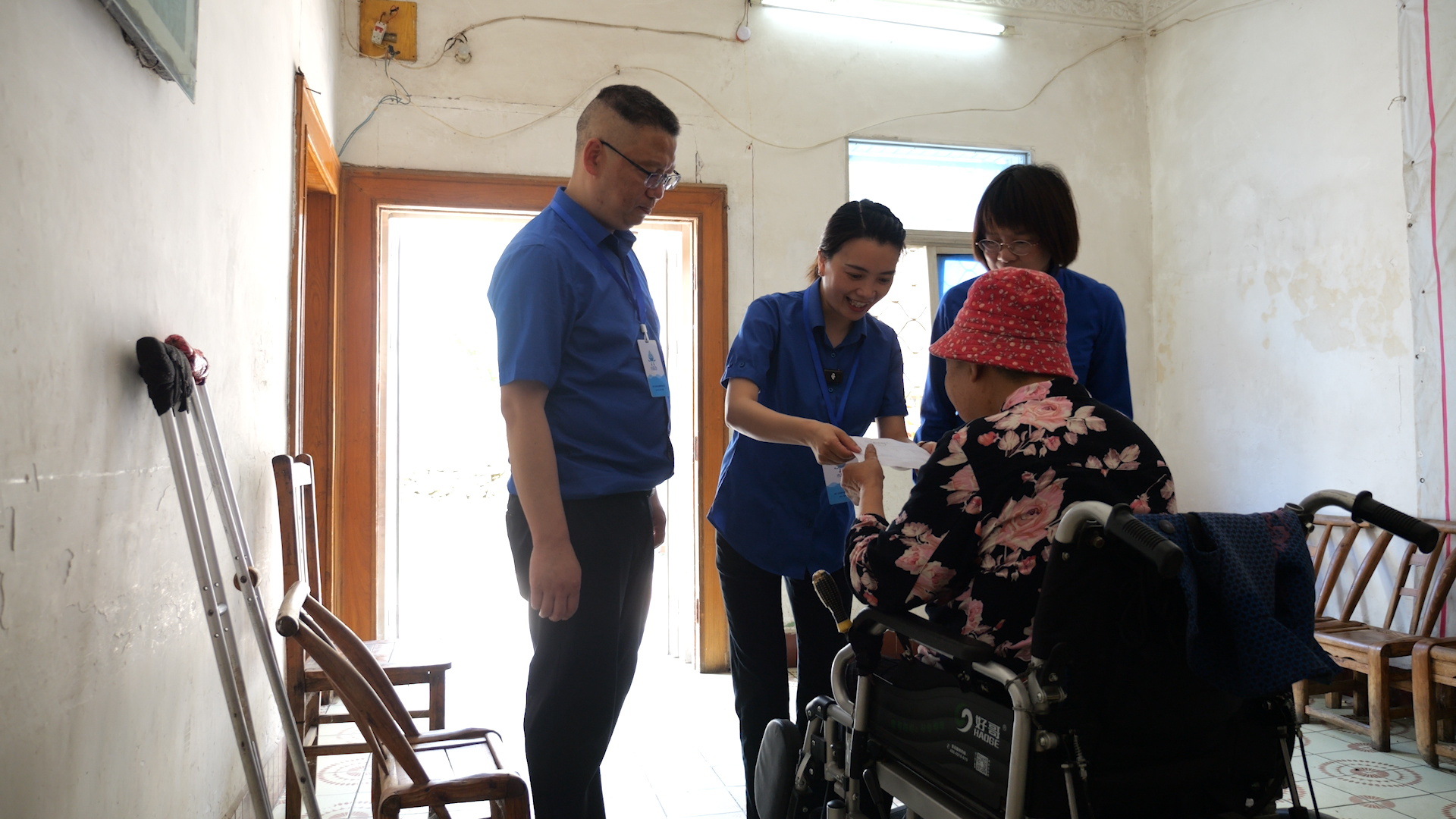 圖為水務(wù)集團(tuán)工作人員為出行困難老人送水費(fèi)發(fā)票。