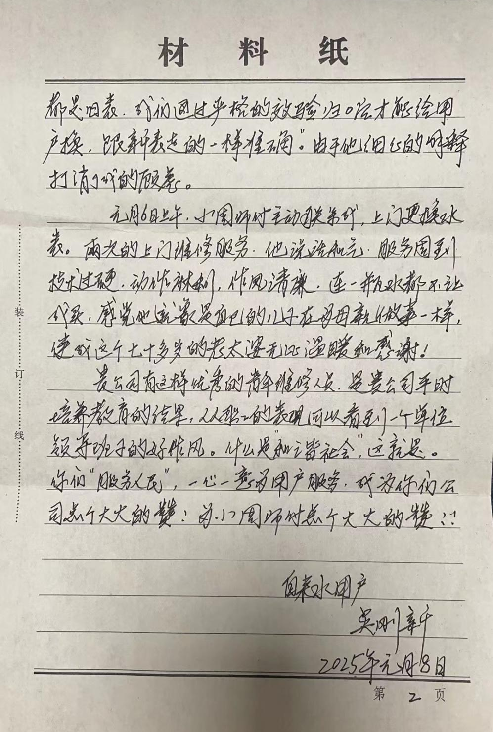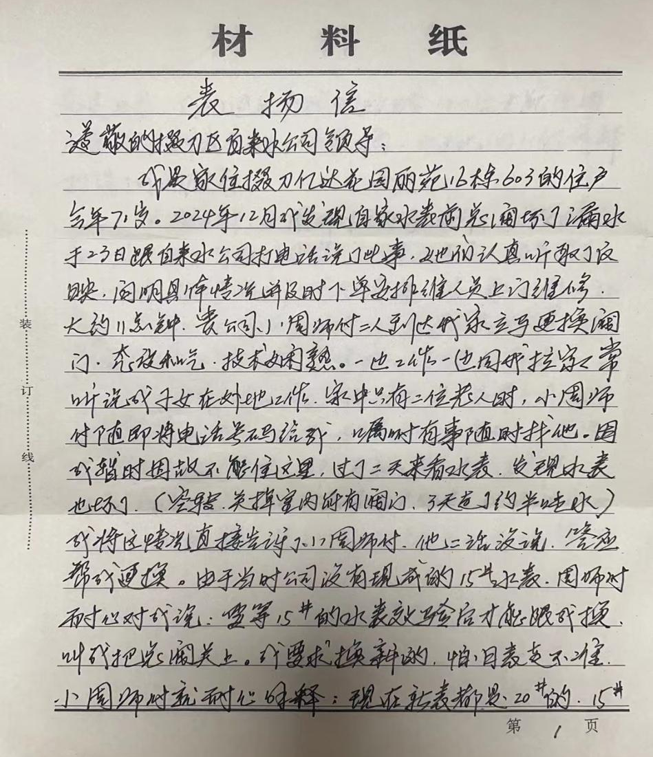 在表揚(yáng)信中,老人深情表達(dá):“家中只有我們兩位老人,水務(wù)集團(tuán)的維修人員就像我們的兒子一樣,他說話和氣,服務(wù)周到,技術(shù)過硬,動(dòng)作麻利,作風(fēng)清廉,讓我們感到無比溫暖。”