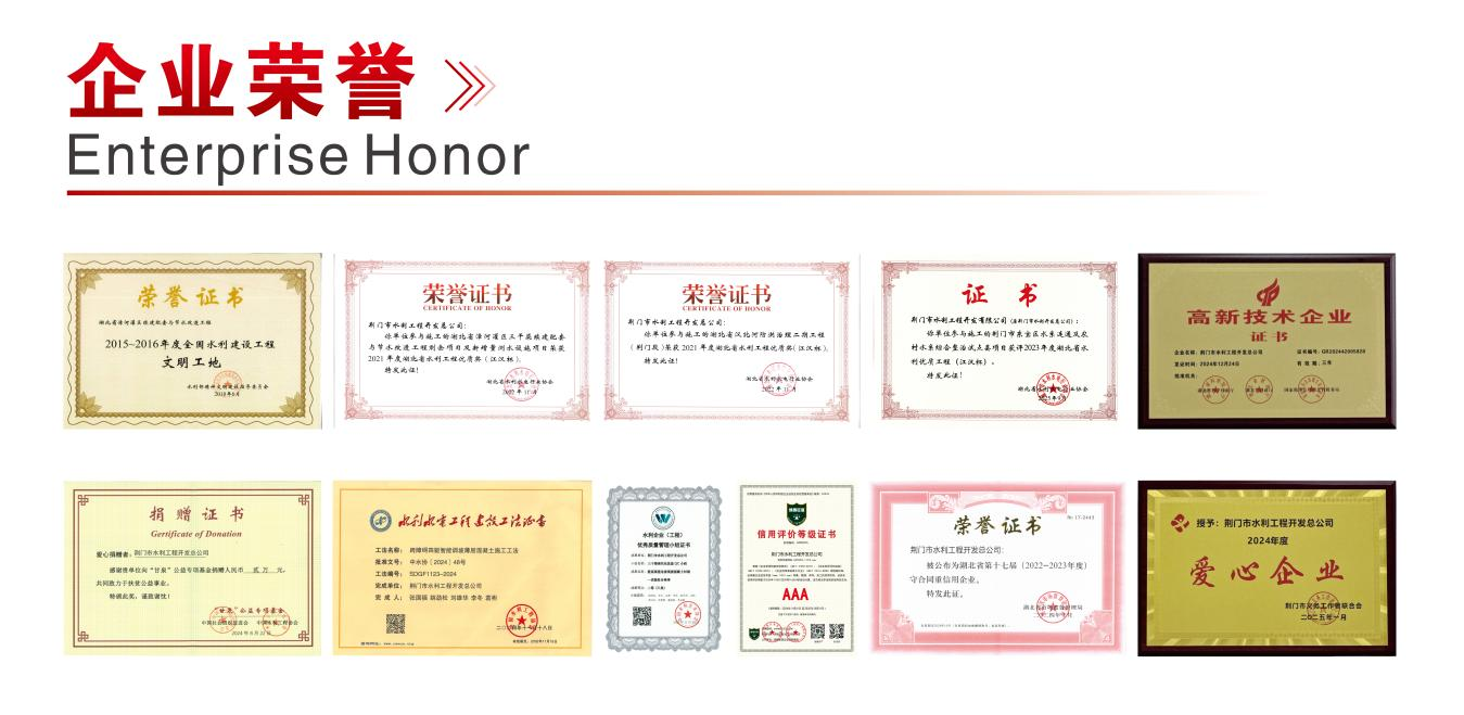 連續(xù)十五年獲評省市級“守合同 重信用”單位的榮譽稱號,連續(xù)十三年榮獲ISO三體系認(rèn)證證書,連續(xù)五年榮獲水利部頒發(fā)的全國水利建設(shè)市場主體信用等級AAA級證書。先后被國家、省、市主管部門授予全國企業(yè)征信系統(tǒng)立信單位、省市水利系統(tǒng)先進施工企業(yè)、先進基層黨組織、安全生產(chǎn)先進單位等榮譽稱號。