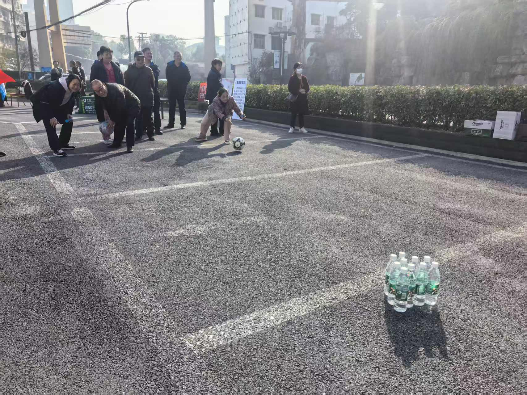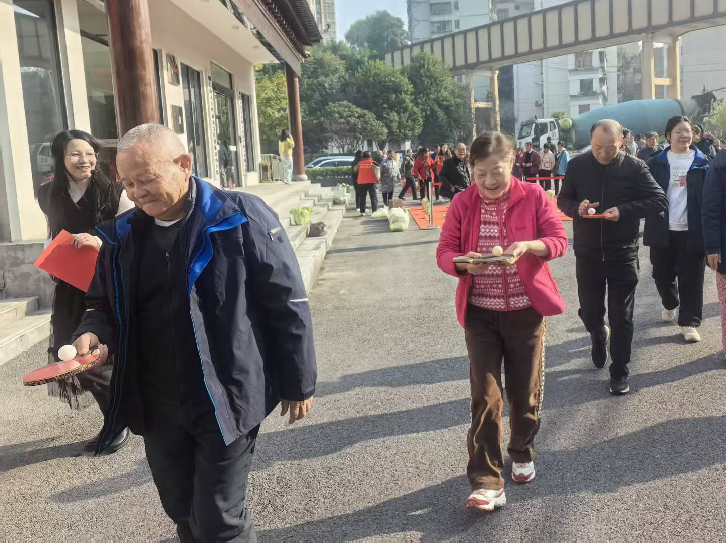 趣味保齡球項(xiàng)目中,老人們瞄準(zhǔn)塑料瓶陣滾球,擊倒瓶子時(shí)的歡呼聲此起彼伏;歡樂(lè)套圈前,大家瞄準(zhǔn)蔬菜、油鹽醬醋等生活物資投擲,有人接連套中獎(jiǎng)品,開(kāi)心得像個(gè)孩子;球拍托球健步走環(huán)節(jié),老人們小心翼翼托球前行,現(xiàn)場(chǎng)滿(mǎn)是歡聲笑語(yǔ)。