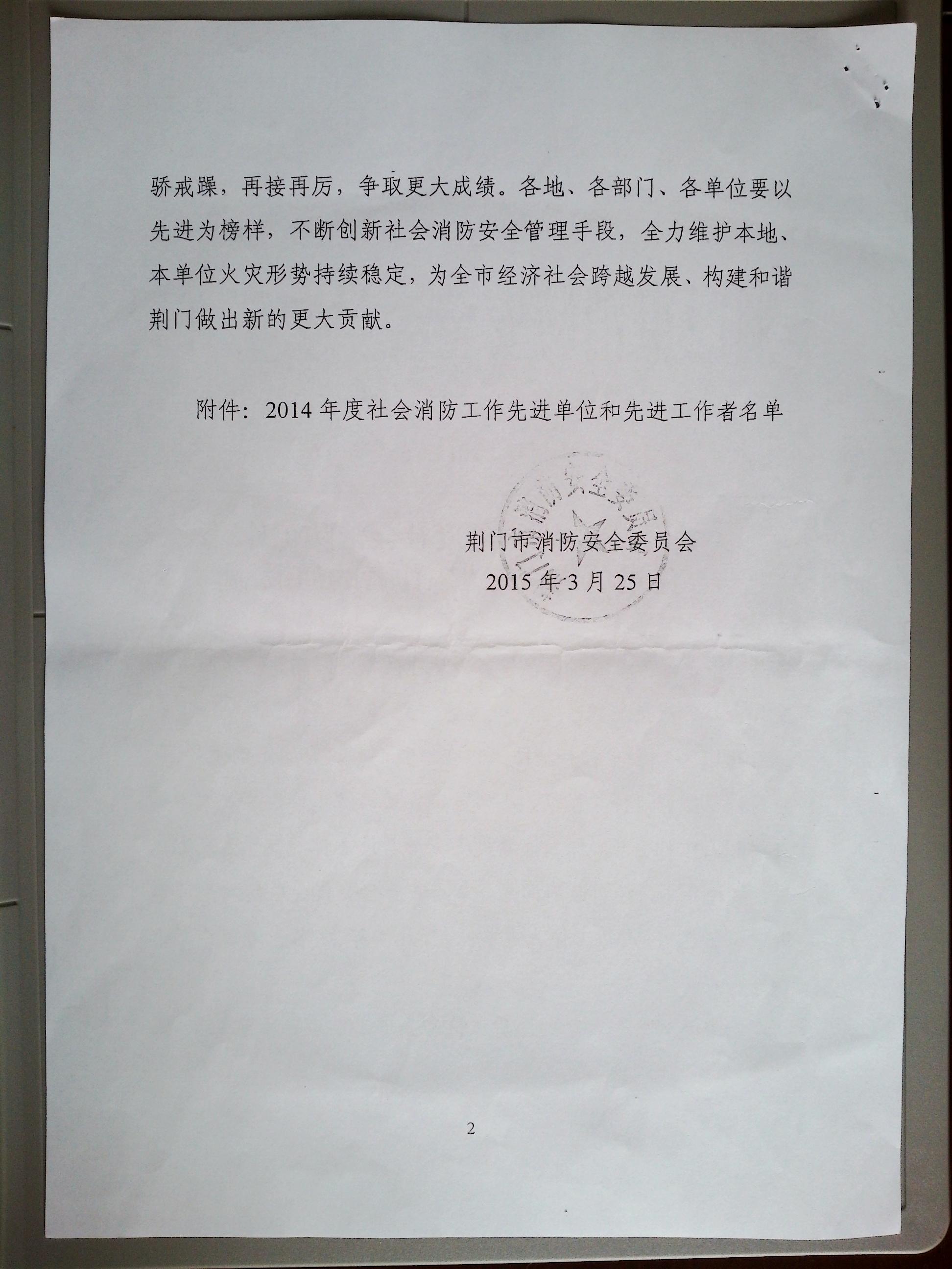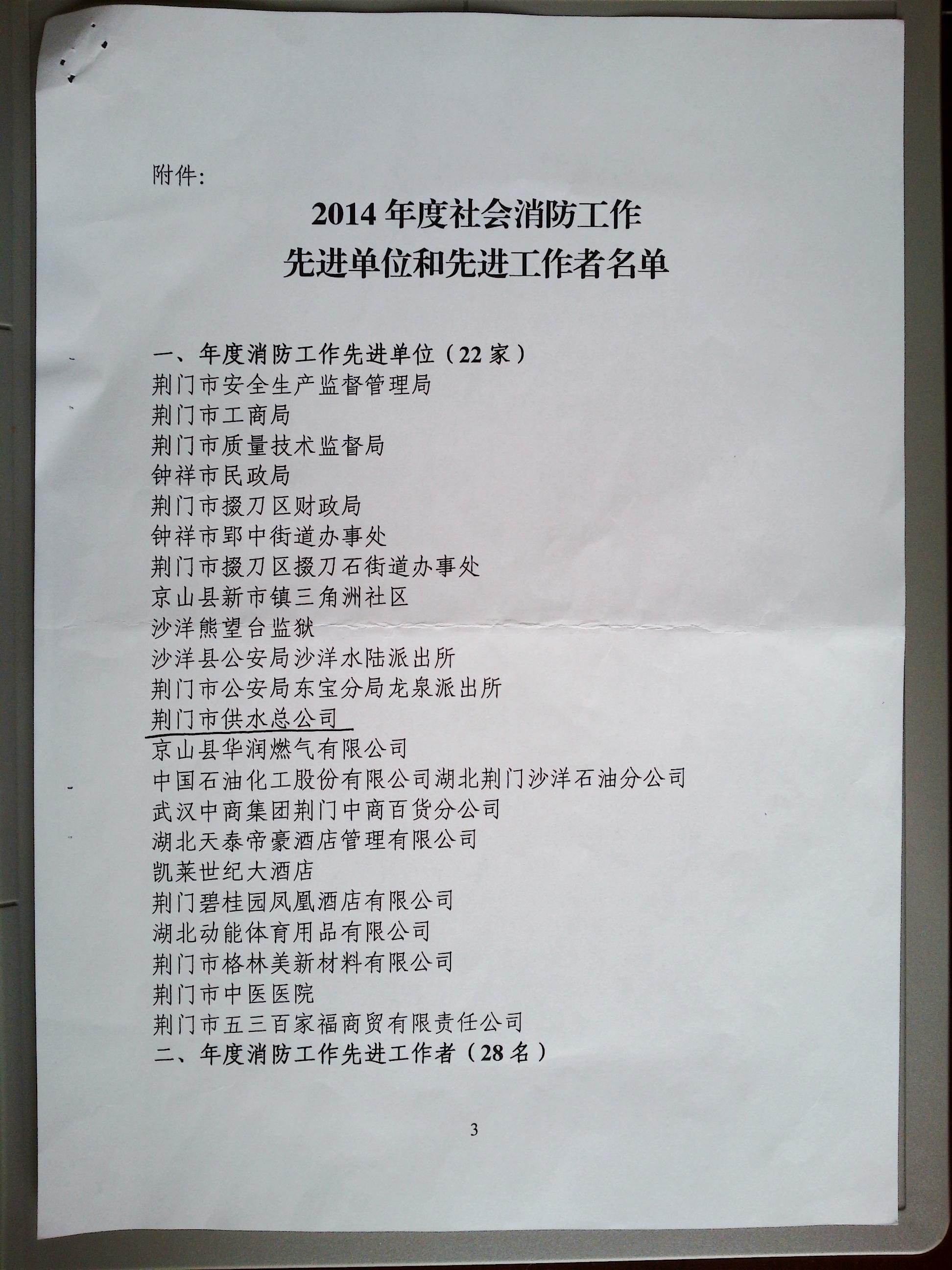 榮譽(yù)快訊;公司獲2014年度消防工作先進(jìn)單位