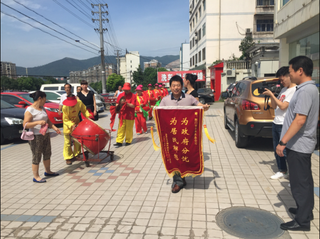 7月31日,虎牙關(guān)社區(qū)和用戶代表組織腰鼓隊(duì)到總公司送錦旗致謝。據(jù)悉,掇刀城南新區(qū)金苑大市場(chǎng)主、分水管網(wǎng)嚴(yán)重老化,水管破損而致停水。市供水總公司客服部門(mén)快速勘測(cè)報(bào)裝,維修處迅速組織施工,并調(diào)派應(yīng)急供水車(chē)在改造期間為商戶送水。