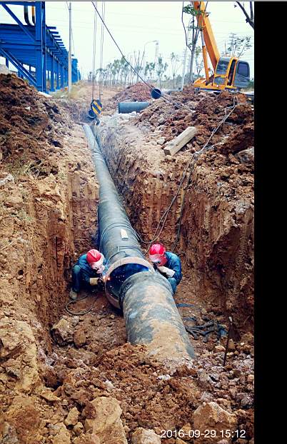 盈德氣體是荊門石化油品升級改造配套項目,是荊門市委、市政府重點招商引資項目,落戶于化工循環(huán)產業(yè)園。為服務好化工循環(huán)產業(yè)園,荊門市供水總公司19日接到鋪設盈德氣體專用DN600供水管道施工任務后,打破常規(guī),當晚就安排人員、分解任務;9月20日上午完成施工隊伍組織,工地測量、工程材料采購,下午立即進場溝槽開挖。施工期間正逢207外環(huán)線與陽光大道部分路段封閉改造,公司積極與道路改造方協(xié)調,利用每天道路施工間歇,將20根鋼管100根球墨管順利運轉至工地。為了能在預定時間內完成任務,工人每天早晨5點半進入施工現(xiàn)場,一直到晚上10點施工結束,中午不休息,早、中、晚三餐就在現(xiàn)場吃快餐。十天鋪通盈德氣體專用840米DN600供水管道。