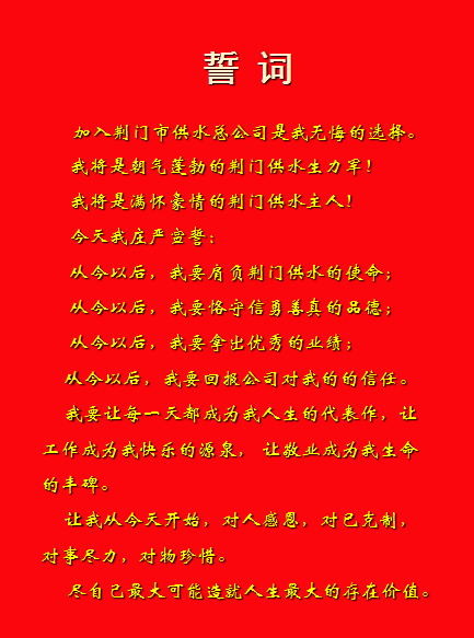 為進一步激發(fā)供水人做好本職工作的榮譽感、使命感和責(zé)任感,11月9日下午,市供水總公司在五樓會議室首次舉行新進員工入職宣誓儀式,讓他們用誓言表達對企業(yè)、對供水職業(yè)的忠誠。