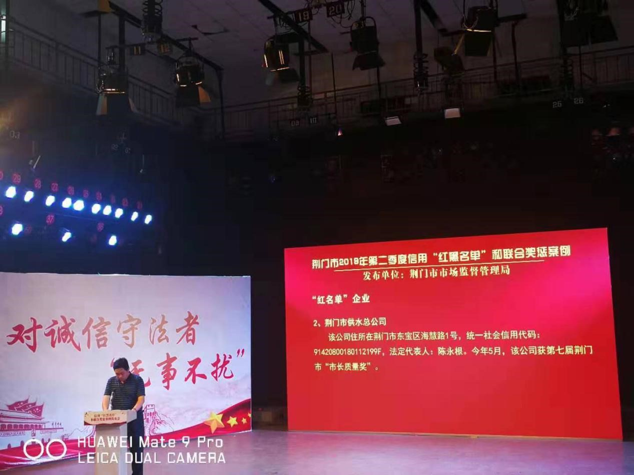 7月24日下午,荊門市社會信用體系建設領導小組辦公室、市發(fā)改委、人行荊門市中心支行聯(lián)合組織召開第二季度信用“紅黑名單”和聯(lián)合獎懲案例發(fā)布會。會上,市供水總公司被授予“全市市場監(jiān)管領域守信企業(yè)”榮譽稱號,入選荊門市守信企業(yè)“紅名單”。