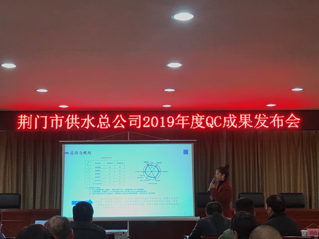 12月6日,荊門市供水總公司首屆QC成果發(fā)布會在總公司六樓會議室順利召開,質(zhì)量專家、國家級評審員劉佐光老師、荊門市質(zhì)量協(xié)會田政武秘書長、公司副總經(jīng)理徐安祥及各部門主要負責(zé)人參加了發(fā)布會,會議由QC工作組組長劉昕平主持。