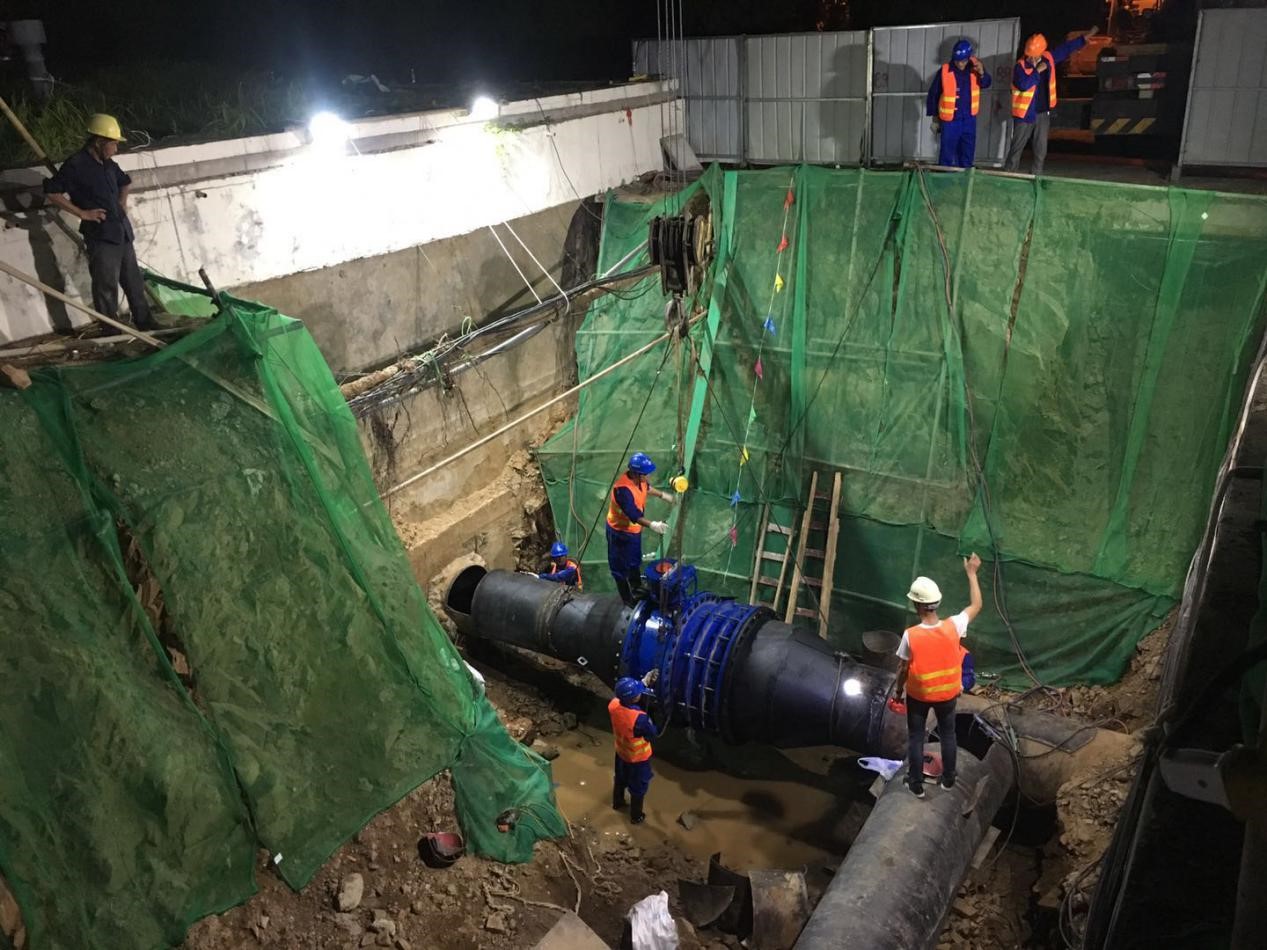 20日晚10時(shí),項(xiàng)目現(xiàn)場管理人員強(qiáng)化工序銜接,緊盯現(xiàn)場監(jiān)督,施工作業(yè)人員挑燈夜戰(zhàn),施工隊(duì)伍兵分三路,密切協(xié)調(diào)配合,分別對DN1200、DN1000鋼管共5處碰頭點(diǎn)進(jìn)行施工,管道切割、排水、吊裝、安裝閥門、焊接……施工現(xiàn)場井然有序,一道道工序推進(jìn)有條不紊,不一會兒工人們的汗水都濕透了全身。21日凌晨2:00突降暴雨,施工人員“硬核”表現(xiàn),克服惡劣天氣的影響,在水中連續(xù)辛勤作業(yè)近10個(gè)小時(shí),碰頭任務(wù)于21日8時(shí)順利完工。