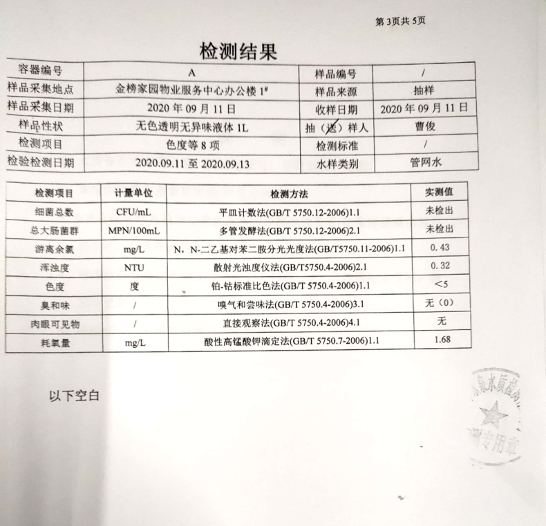 本著“用戶至上”的服務宗旨,為徹底消除用戶對荊城自來水水質問題的疑慮,檢測人員再次進行現(xiàn)場抽樣,并將水樣送至有相關檢驗檢測資質的第三方檢測機構—荊門市詠泉水質檢測有限公司進行檢測。檢測結果顯示該用戶家中自來水各項指標均符合《生活飲用水衛(wèi)生標準》(GB5749-2006)。具體檢測項目及結果見下圖: