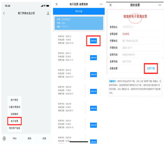 用戶在繳費成功后,只需關注“荊門市供水總公司”微信公眾號或登錄網(wǎng)上營業(yè)廳,進入電子發(fā)票模塊,即可查詢、申領、下載打印水費電子發(fā)票。目前,電子發(fā)票系統(tǒng)運行平穩(wěn)順利。