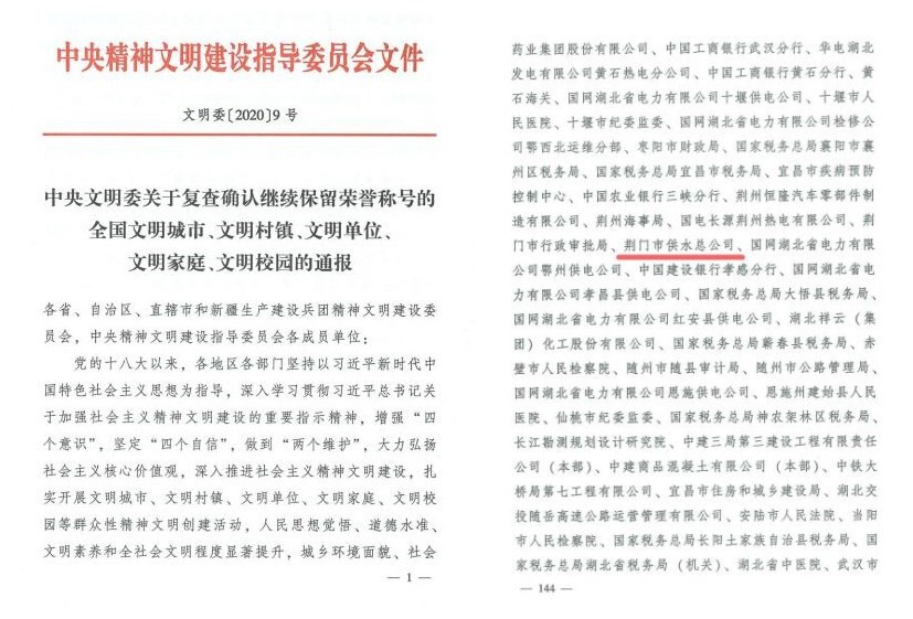 據(jù)悉,“全國(guó)文明單位”稱號(hào)是中央文明委授予創(chuàng)建單位的最高榮譽(yù)。市供水總公司繼續(xù)保留榮譽(yù)稱號(hào),是企業(yè)文明單位創(chuàng)建活動(dòng)扎實(shí)推進(jìn)、創(chuàng)新發(fā)展的一大豐碩成果。公司連續(xù)十一屆被省委、省政府授予省級(jí)文明單位,連續(xù)十二屆被市委、市政府授予市最佳文明單位,2017年被中央文明辦授予“全國(guó)文明單位”。2018年,在市消費(fèi)者委員會(huì)發(fā)起的公服企業(yè)滿意度調(diào)查中,公司總成績(jī)排名第一,被授予“消費(fèi)者滿意單位”和“消費(fèi)者滿意品牌”。2019年,由于成功推行卓越績(jī)效管理和用戶滿意管理,被市政府評(píng)選為第七屆荊門(mén)市“市長(zhǎng)質(zhì)量獎(jiǎng)”獲獎(jiǎng)企業(yè);因全面推進(jìn)依法治企,被評(píng)為湖北省省級(jí)“法治建設(shè)示范企業(yè)”;被荊楚網(wǎng)表彰為“全省優(yōu)秀政務(wù)微信公眾號(hào)”;作為全國(guó)唯一一家供水企業(yè),榮獲2019年全國(guó)市場(chǎng)質(zhì)量信用AA等級(jí)“用戶滿意企業(yè)”稱號(hào)。2020年,公司先后被評(píng)為荊門(mén)市建設(shè)江漢平原振興發(fā)展示范區(qū)先進(jìn)集體,在全市要素保障類(lèi)滿意度測(cè)評(píng)中繼續(xù)名列榜首。三水廠團(tuán)支部被共青團(tuán)中央表彰為“全國(guó)五四紅旗團(tuán)支部”。詠泉水質(zhì)檢測(cè)有限公司曹俊同志榮獲“全市優(yōu)秀共產(chǎn)黨員”和“荊門(mén)市抗擊新冠肺炎疫情先進(jìn)個(gè)人”榮譽(yù),供水維修班長(zhǎng)黃磊獲評(píng)“荊門(mén)好人·最美逆行者”榮譽(yù)稱號(hào),加壓站員工閆寒家庭榮獲2020年“最美家庭”榮譽(yù)稱號(hào)。