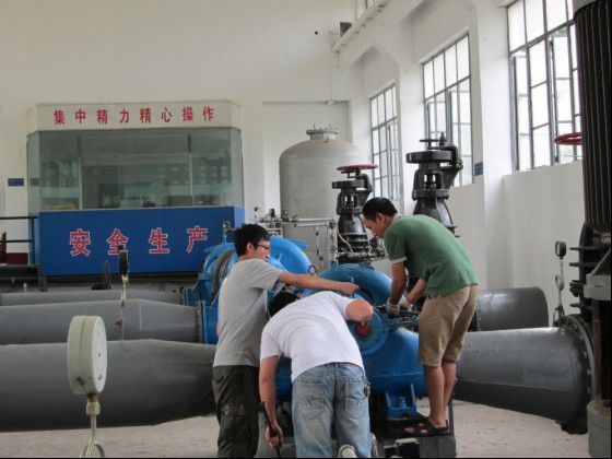近日,氣溫逐漸攀升,為確保高峰供水時供水設(shè)備的正常運行,市供水公司加壓站組織維修人員搶前抓早、多措并舉,加強(qiáng)對供水設(shè)施、設(shè)備的維修保養(yǎng)。圖為加壓站維修人員在維護(hù)3#送水泵。